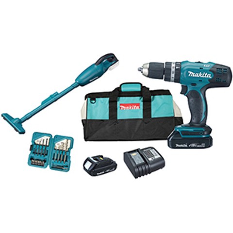 DHP453 + DCL180 + Set pribora Akumulatorski udarni vrtalnik - vijačnik DHP453SYE Št. vrtljajev v prostem teku - 1.st. 0 - 400/min Št. vrtljajev v prostem teku - 2.st. 0 - 1300/min Št. udarcev - 1.st 0 - 6.000/min Št. udarcev - 2.st 0 - 19.500/min Razpon vpenjalne glave: 1,5 - 13 mm Zmogljivost vrtanja (jeklo): 13 mm Zmogljivost vrtanja (kamen): 13 mm Zmogljivost vrtanja (les): 36 mm Vrtilni moment (trdo/mehko): 42/27 Nm Akumulator: 18 V/1,5 Ah Teža po EPTA: 1,7 kg Mere (D x Š x V): 232 x 79 x 227 mm Akumulatorski sesalnik DCL180Z Količina zraka: 1.300 l/min Prostornina posode: 0,65 l Največji pretok zraka: 1.3 m/3/min Podtlak 3,6 kPA Napetost akumulatorja: 18 V Priložena oprema: Torba za prenašanje 2 x aku. 18 V/ 1.5 Ah Polnilnik DC 18SD