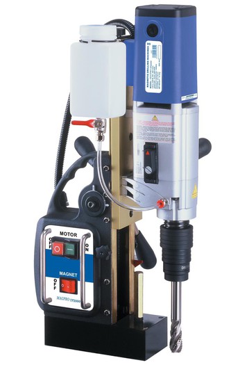 Magnetni vrtalni stroj JEPSON MAGPRO TP 2000 * Specialist za rezanje navojev * Kvalitetno izdelan magnetni vrtalni stroj nam omogoča vrtanje z kronskimi in spiralnimi svedri in nudi nam tudi možnost rezanja navojev do M20. TEHNIČNE KARAKTERISTIKE: * Napajanje 230V/50Hz * Moč: 1.1kw * Max. kapaciteta vrtanja v jeklo : 13x110 mm * Hod vrtanja: 150 mm * Fi luknje x globina 35 x 50 mm kronski sveder 20 x40 mm navojni sveder 13 x 80 mm spiralni sveder * Vpetje: Weldon 19mm, navojnik M