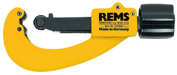 REMS RAS Cu-INOX – visoko obremenljiv rezalnik cevi za rezanje cevi iz nerjavnega jekla, C-jekla, bakra i. dr. Robustna, stabilna konstrukcija za težke razmere uporabe. Posebej stabilno vreteno, dolgo vodilo vretena in posebej kaljeni protipritisni valji. Zaradi tega natančno vodenje ob cevi, enostavna dostava, enostavno rezanje in natančen pravokoten rez. Rezalnik cevi za cevi Ø 6 – 64 mm, ¼ – 2½"