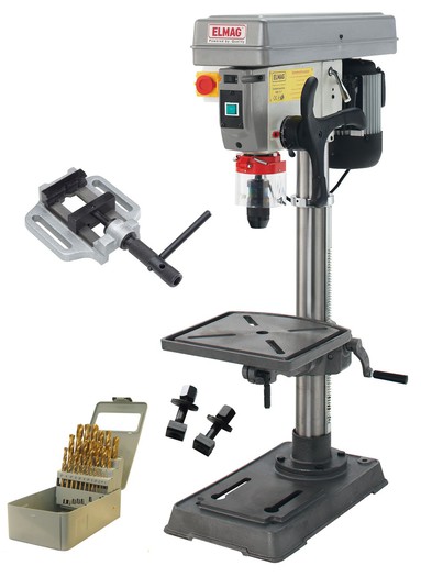 jeklen steber z zobato letvijo * Osnovna plošča z vpenjalnimi utori * Varnostno stikalo IP 54 s podnapetostno zaščito UGODEN AKCIJSKI SET : * Strojni primež 75 mm * Vpenjalni vijaki 16 mm * Set spiralnih svedrov HSS-TiN v kaseti 25 delni, 1-13mm